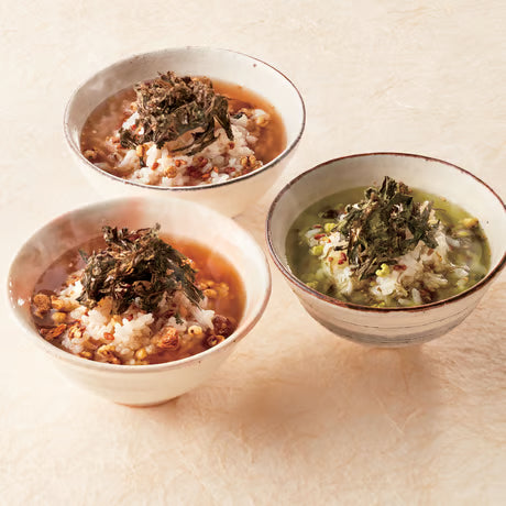 【内容量】無添加お茶漬け(緑茶のり1食入4個、ほうじ茶しそ1食入3個、和紅茶しいたけ1食入×3個)、緑茶粉末18g ほうじ茶粉末18g 【原材料】 [お茶漬け]○緑茶のり:炒り玄米(国内製造)、食塩、乾のり、はとむぎ、緑茶(奈良県製造)、ごま、昆布、きび砂糖 ○ほうじ茶しそ:炒り玄米(国内製造)、食塩、乾のり、きび砂糖、はとむぎ、ほうじ茶(緑茶奈良県産)、紫蘇、ごま、梅、梅酢 ○和紅茶しいたけ:炒り玄米(国内製造)、食塩、乾しいたけ、乾のり、和紅茶(奈良県製造)、はとむぎ、ごま、きび砂糖 [ 緑茶粉末 ] :緑茶(奈良県産)、[ ほうじ茶粉末 ] :ほうじ茶(緑茶奈良県産) 【商品説明】 無添加お茶漬けは、自然そのままの「素材」と「お茶」を管理栄養士の目線でバランスよく組み合わせています。お茶が入っているので、お湯を注ぐだけで美味しい大和茶入りのお茶漬けをお召し上がりいただけます。 緑茶粉末ブレンド茶は、茶葉を微粉末にする事で今まで急須に残っていた7割の栄養成分をそのままぜんぶいただけるようになりました。 奈良の3つのお茶農家さん(月ヶ瀬2箇所、田原地区1箇所)が、農薬を使用せず大切に育てお茶をオリジナルブレンドしました。緑茶は栄養たっぷりのジャパニーズスーパーフード。カテキン.ビタミンA.C.E.K.葉酸などが豊富。カフェイン1杯1g当たり200ccで23mg、急須で入れた場合の約半分になっているので安心して飲んでいただけます。 奈良県では家庭でよく飲まれているほうじ茶。香ばしい芳醇な香り、後味はすっきりしています。急須で飲むお茶よりカフェイン量は少なめ。お子さんや妊婦さんにも安心して飲んでいただけるやさしいお茶です。 毎日飲んでも飽きがこないお茶です。 ***奈良の大和茶が詰まったギフトボックスです。