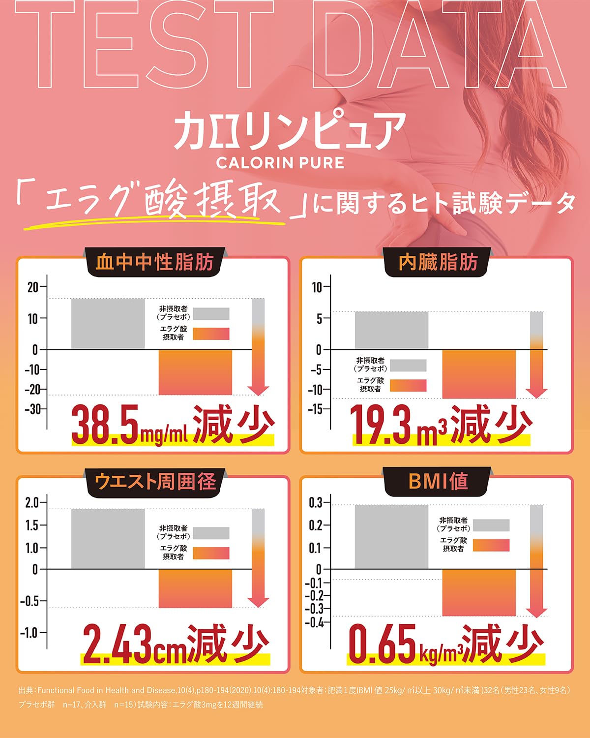 - 🍴【美味しく食べて理想のあなたに】カロリンピュアは肥満気味の方の体重・体脂肪・血中中性脂肪・内臓脂肪・ウエスト周囲径の減少をサポートし、高めのBMI値も改善する機能性を持つエラグ酸を主成分としたダイエタリーサポートサプリメントです。ヒト試験データでも実証がされている実績ある成分となります。美味しく食べて理想のあなたに、カロリンピュアはあなたの食生活と身体づくりをサポートします!