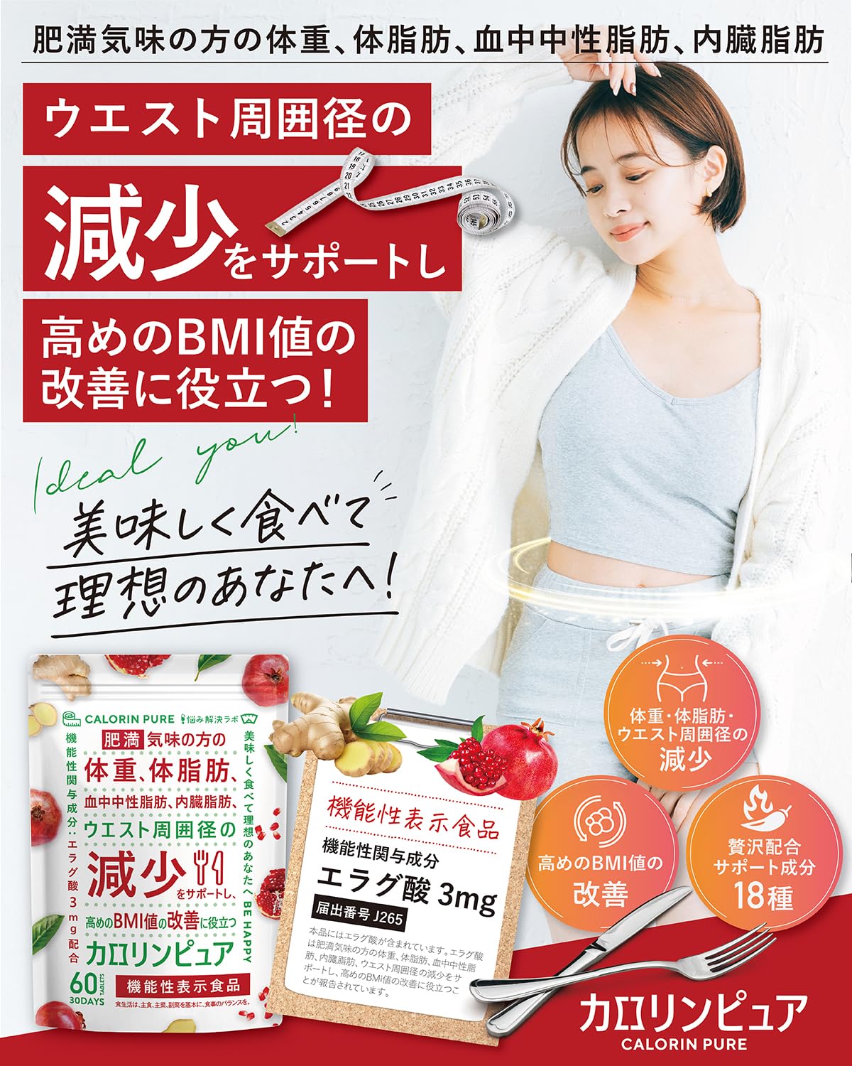 カロリンピュア 30日分 肥満気味の方の体重 体脂肪の減少を助ける 血中中性脂肪 内臓脂肪 ウエスト周囲径 の減少をサポート 高めの BMI値 の改善に役立つ 機能性表示食品 18種のサポート成分贅沢配合 コエンザイムQ10 悩み解決ラボ