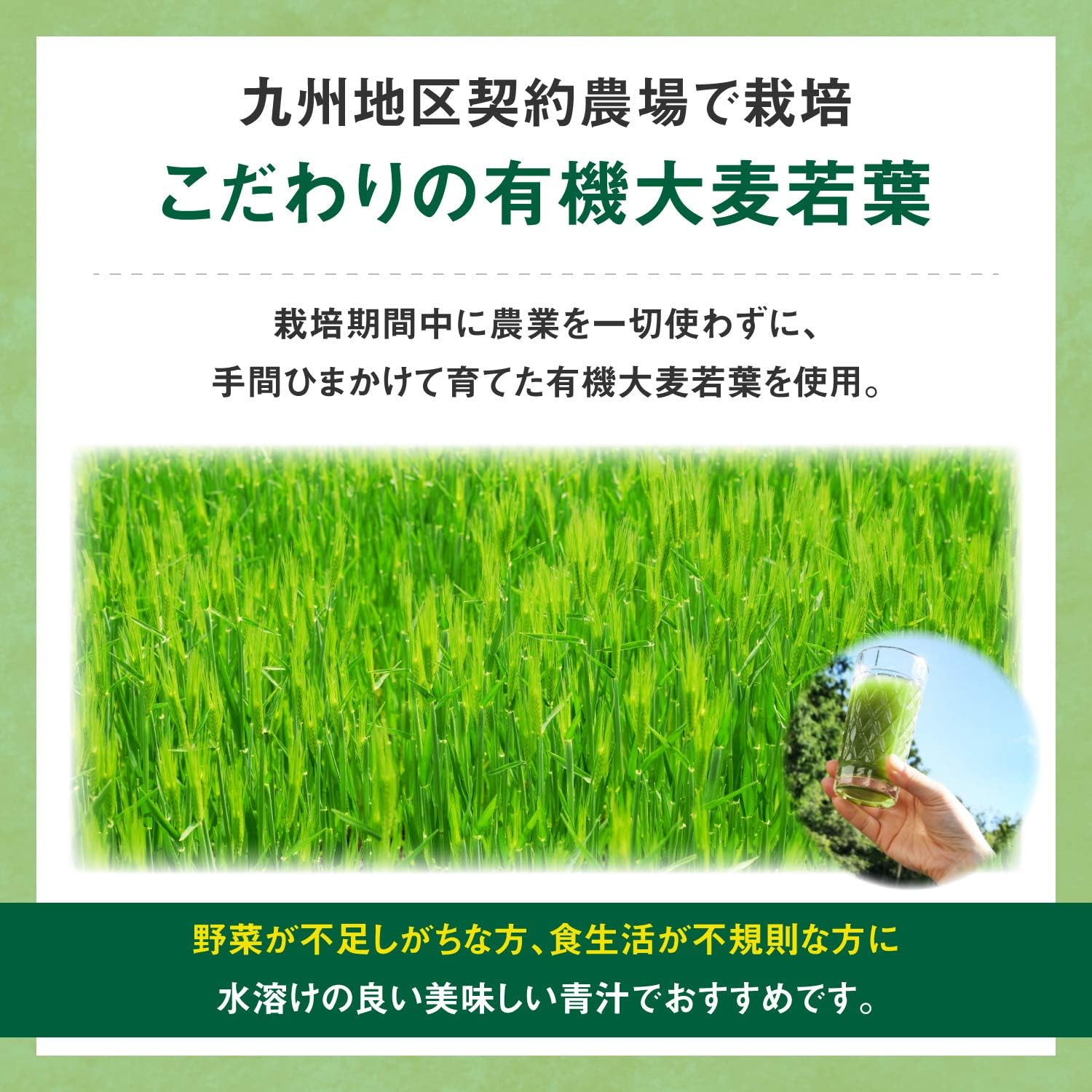 九州地区契約農場で農薬を使わず栽培した有機大麦若葉をまるごと粉砕 国産有機大麦若葉に水溶性食物繊維、カルシウム、オリゴ糖、セサミ(黒ゴマ)を加えた健康志向の栄養補助食品です。 食物繊維やカルシウムを豊富に含んでいますので、野菜が不足しがちな方、食生活が不規則な方にお勧めです。