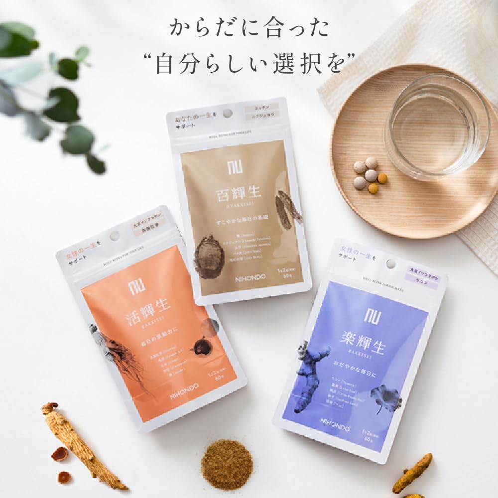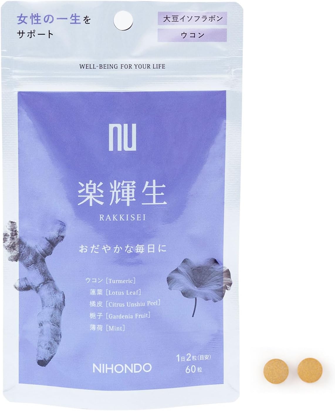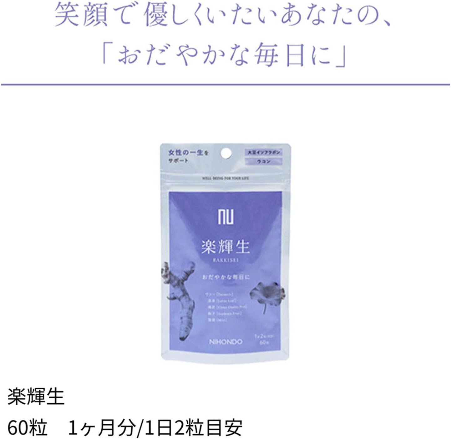 楽輝生 60粒 1ヶ月分 1日2粒目安 大豆イソフラボン アグリコン型 30mg サプリメント 薬日本堂 nu ウコン クロセチン 漢方 ケイケットウ 当帰葉 蓮葉